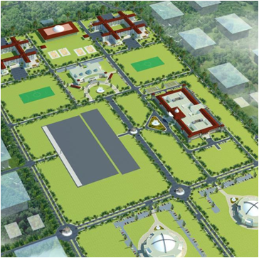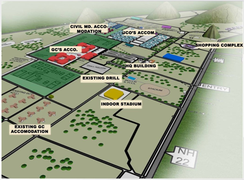 The site for the proposed Academy occupies about 1000 Acres of land area and is strategically located between NH-22 and Sherghati Road. This Academy will be providing military training to 750 cadets every year which calls for state of the art facilities like training infrastructure, Indoor & outdoor sports stadiums, 9 hole Golf course, Libraries, Auditoriums shooting ranges etc. All major proposed buildings are designed to be energy efficient and green rated. The training academies in Army require large expanses of open land and numerous intermittent play fields for the cadets to move around and receive physical training, resulting in small ground coverage that helps us in retaining the intrinsic characters of the terrain as well as its Soil. Over all we have about 3 millions sqft of constructed space to accommodate various requirements of the Academy which shall be built at the cost of 1000 crores. Locally available building materials are being carefully chosen as the Architectural character of the proposed buildings is planned to be robust, monumental and Buddhist in appearance.
